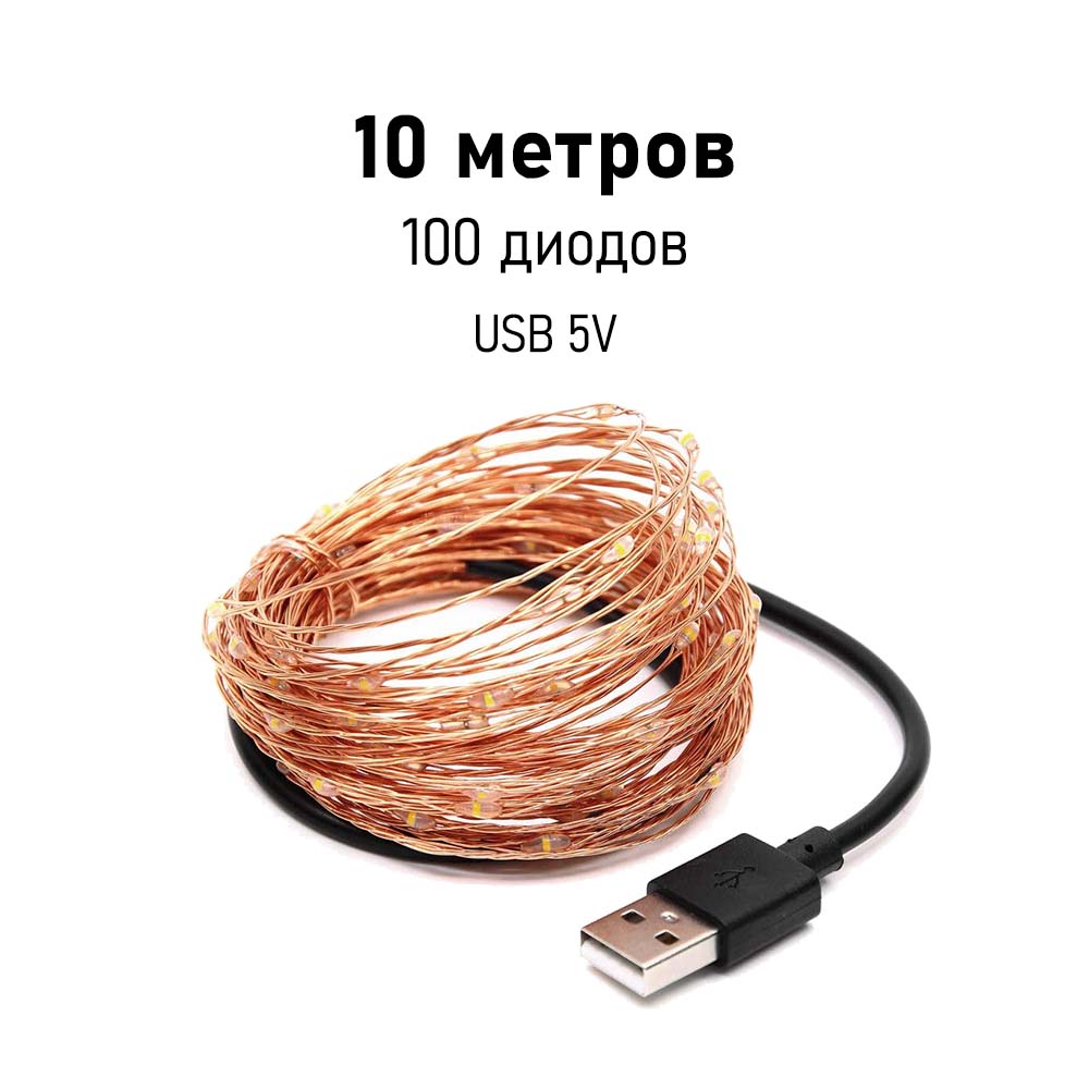 Нить Роса медь, 10 м х 100 диодов от USB, разноцветный