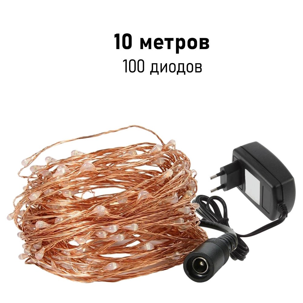 Нить "Роса" медь,10 м х 100 диодов, от сети, теплый белый