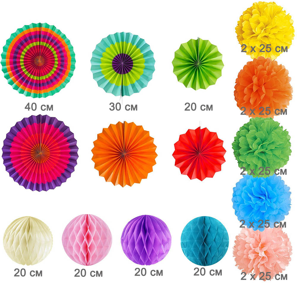 Готовый комплект из бумажных фантов, помпонов и шаров сот, можно применять в качестве декорирования фотозоны к празднику. Подвесные фонарики и шары соты, раскрываются одним движением. Бумажные помпоны необходимо расправить.  Готовый набор доставляется в сложенном виде. Можно использовать несколько раз.