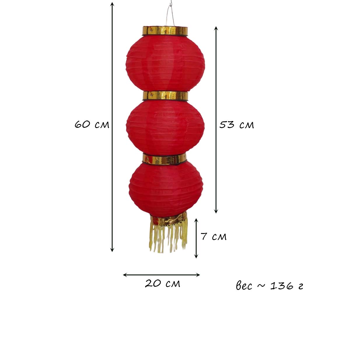 Круглый китайский фонарь состоит из трех ярусов диаметром 20 см каждый.