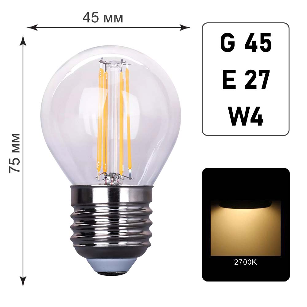 Лампа светодиодная стандарта G45 E27 с мощностью 4Вт. Яркость свечения сопоставима с традиционными лампочками 20Вт. Свечение 210 люменов, 2700 К дарит приятную теплую атмосферу. Является декоративной и используется в гирляндах и светильниках как внутри, так и снаружи помещений. Длительность работы – до 30 000 ч. Не содержит вредных для экологии соединений. Класс энергоэффективности A++.