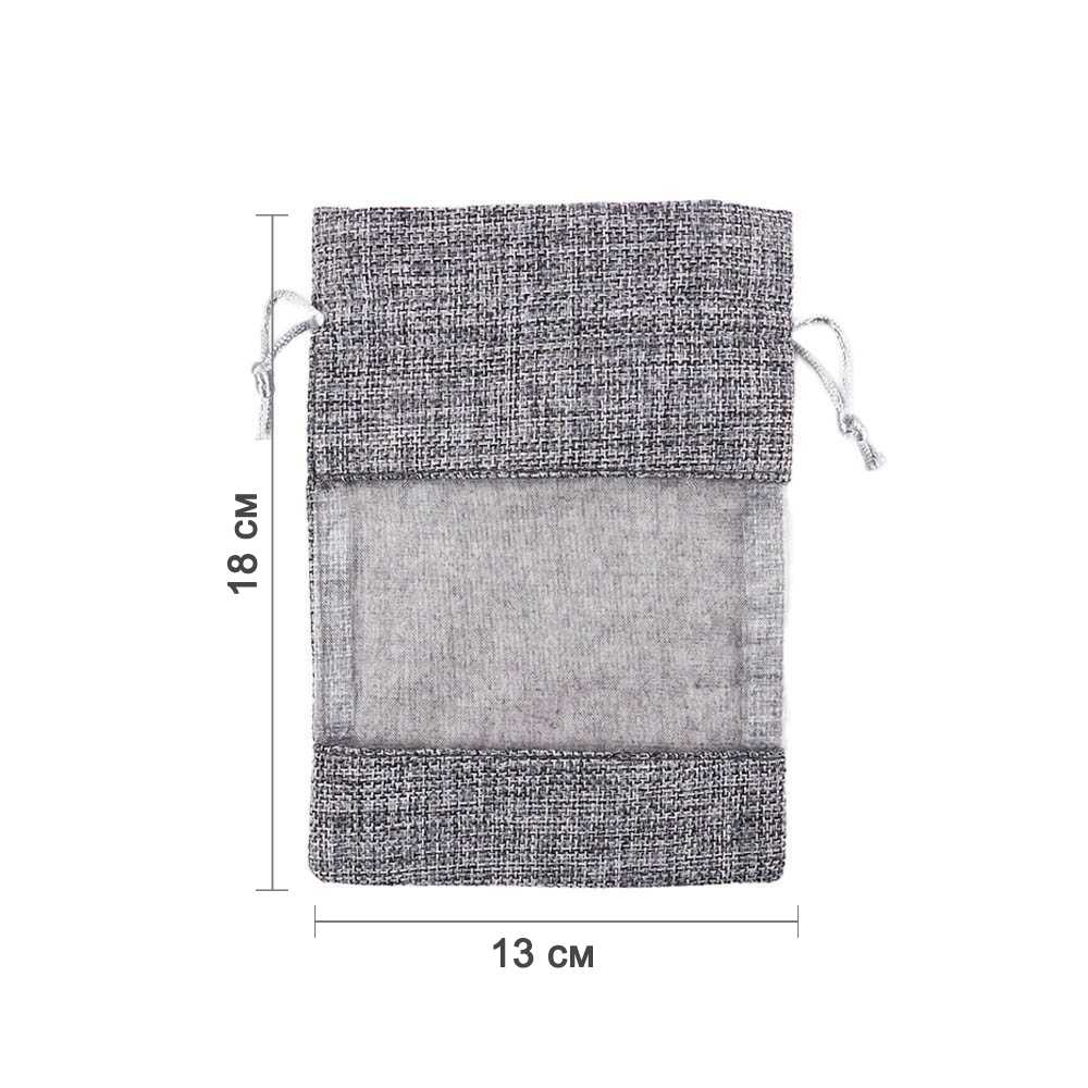 Декоративный мешочек с оригинальным дизайном: верх и дно выполнены из плотной мешковины, а центральная часть — из прозрачной органзы, благодаря чему содержимое хорошо видно со всех сторон. Такое сочетание материалов придаёт упаковке естественный, но при этом лёгкий и изящный вид.