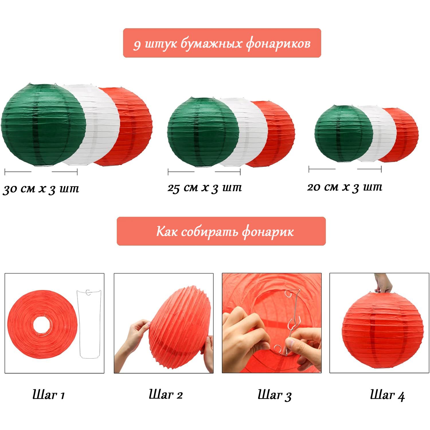 Набор подвесные фонарики 9 шт, белый+красный+зеленый