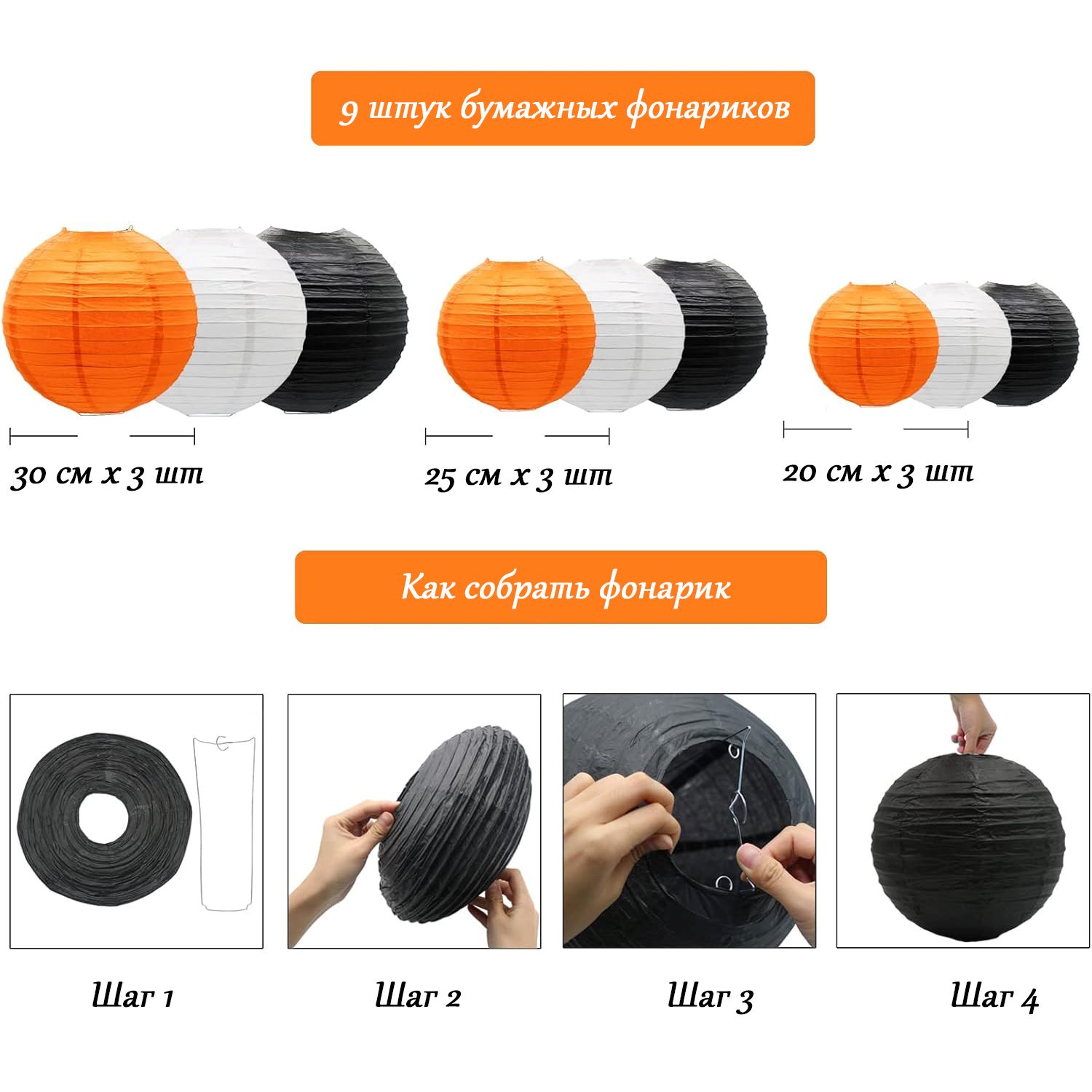 Набор подвесные фонарики 9 шт, белый+оранжевый+черный