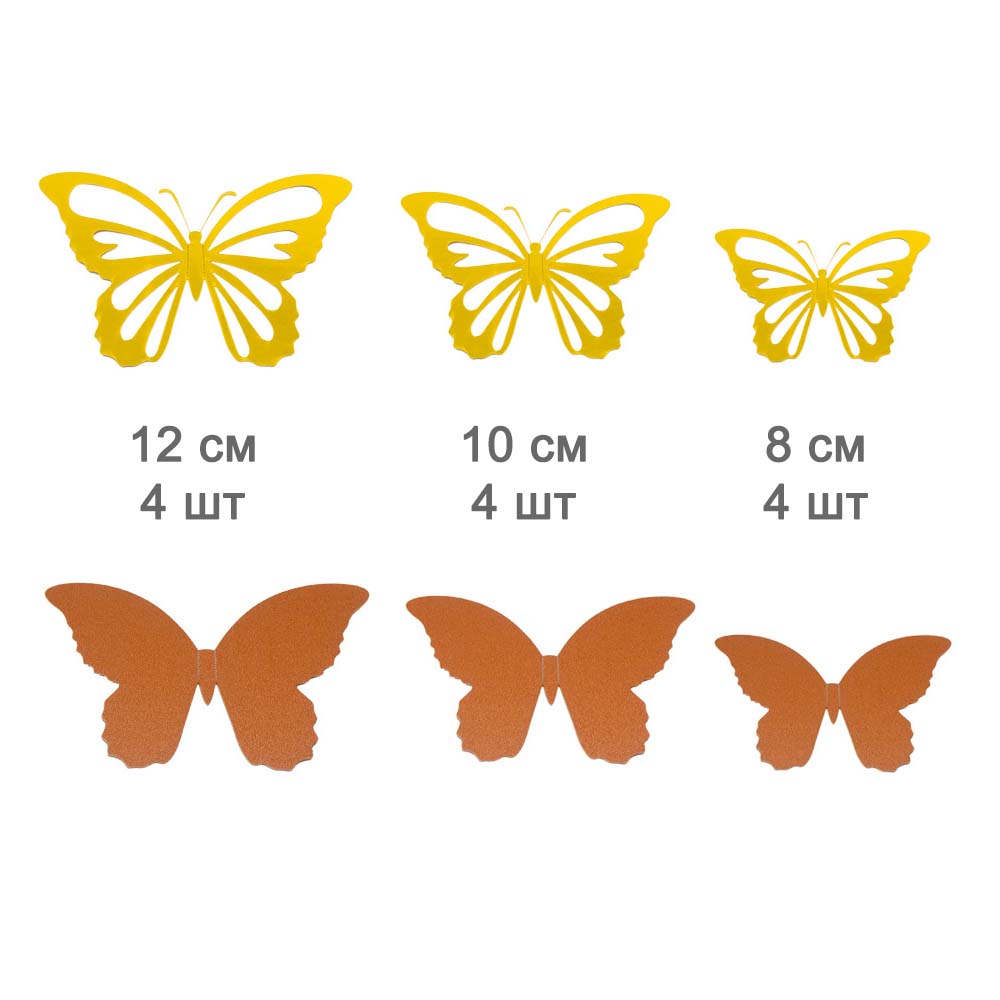 Бабочка состоят из двух частей цветная бабочка + золотая бабочка с перфорацией. Соединяются между собой клейкими кругами, которые идут в комплекте.