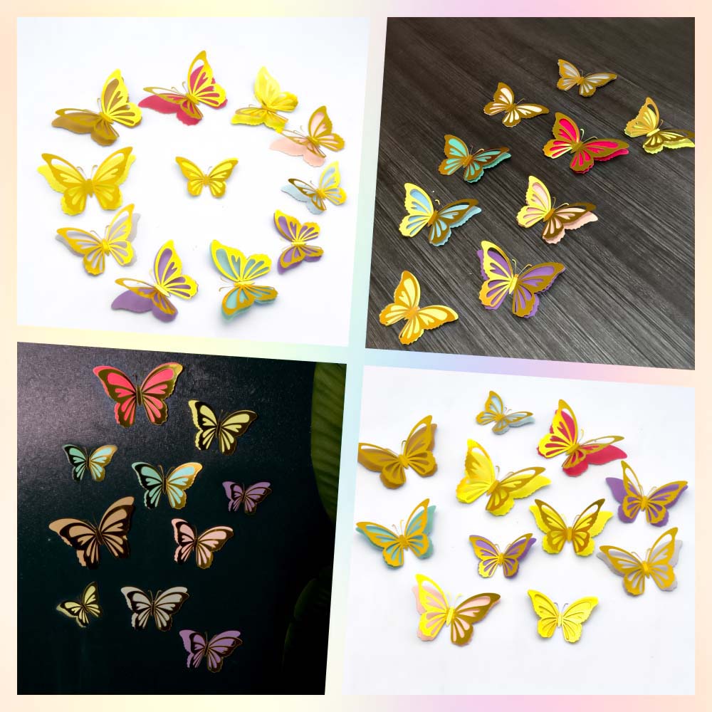Бабочка состоят из двух частей цветная бабочка + золотая бабочка с перфорацией. Соединяются между собой клейкими кругами, которые идут в комплекте.