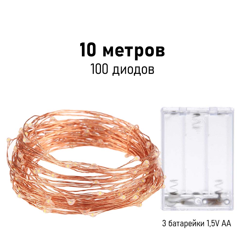 Нить "Роса" медь, 10 м х 100 диодов, от батареек, разноцветный