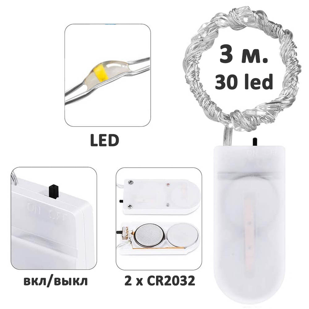 Нить "Роса" серебро, 3 м х 30 диодов, от батареек, разноцветный