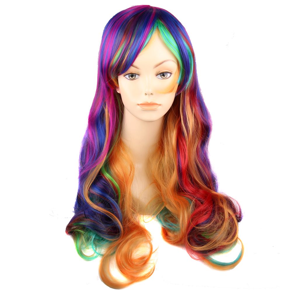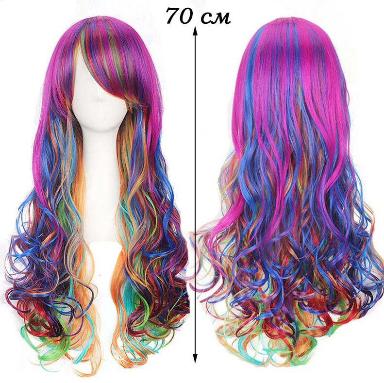 Парик радужный длинный изготовлен из современного искусственного материала.