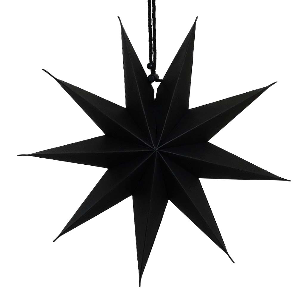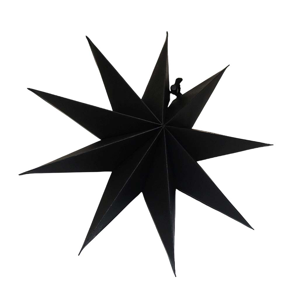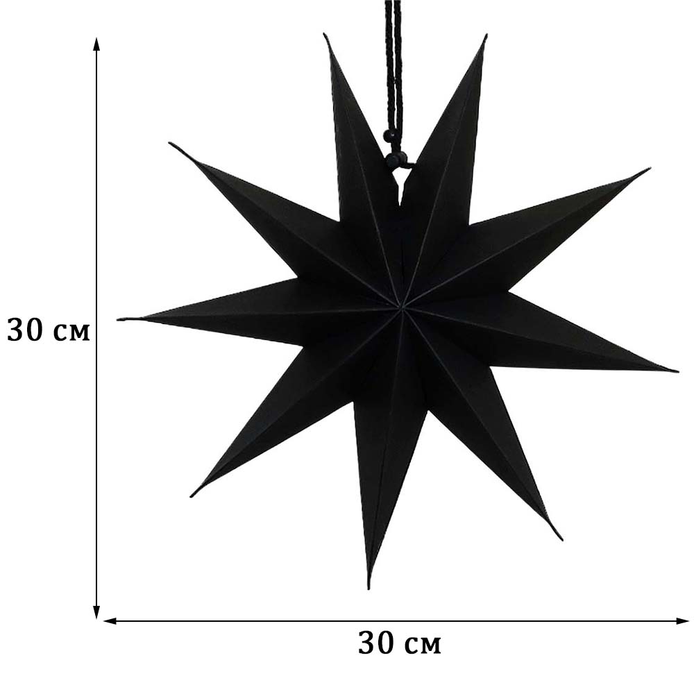 Объёмная декоративная звезда из картона диаметром 30 см с 9 лучами. Оснащена встроенным шнурком для подвешивания. Поставляется в компактном сложенном виде и быстро собирается: специальный шнурок при затягивании придаёт изделию объём и фиксирует форму. После сборки звезда остаётся устойчивой без дополнительных креплений и может использоваться многократно.