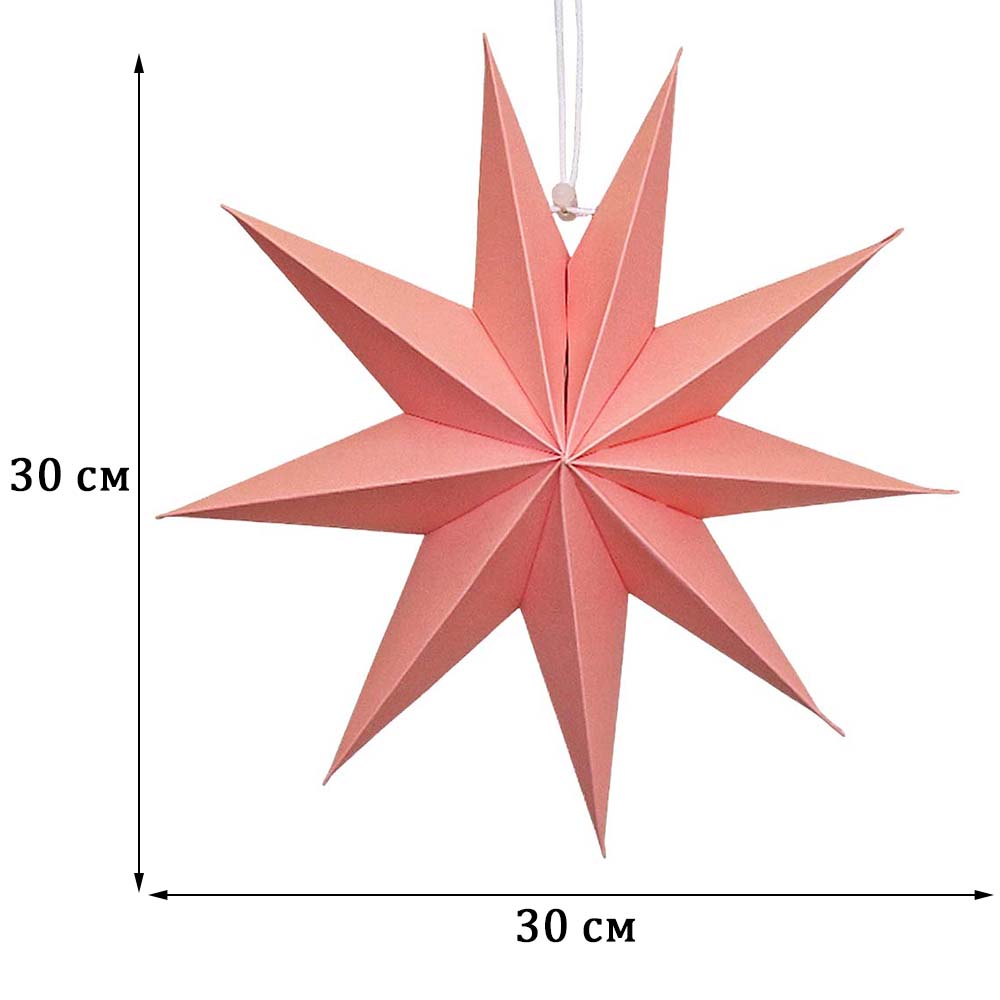 Объёмная декоративная звезда из картона диаметром 30 см с 9 лучами. Оснащена встроенным шнурком для подвешивания. Поставляется в компактном сложенном виде и быстро собирается: специальный шнурок при затягивании придаёт изделию объём и фиксирует форму. После сборки звезда остаётся устойчивой без дополнительных креплений и может использоваться многократно.