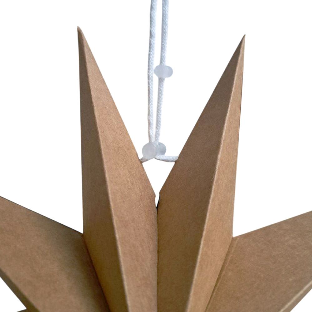 Объёмная декоративная звезда из картона диаметром 30 см с 9 лучами. Оснащена встроенным шнурком для подвешивания. Поставляется в компактном сложенном виде и быстро собирается: специальный шнурок при затягивании придаёт изделию объём и фиксирует форму. После сборки звезда остаётся устойчивой без дополнительных креплений и может использоваться многократно.