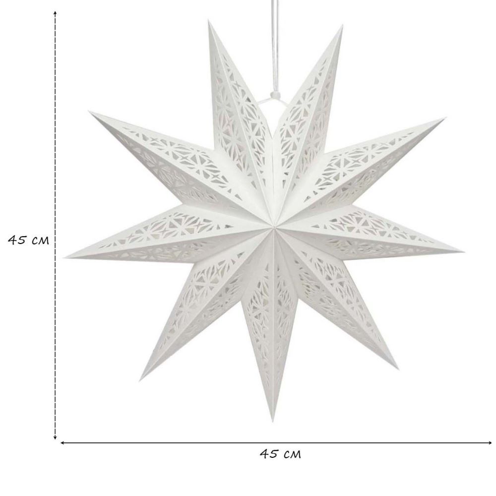 Имеет 9 лучей и встроенный шнурок для подвеса. Доставляется в сложенном виде, легко приводится в рабочее состояние. Для сборки предусмотрен шнурок, который при затягивании формирует объемную фигуру и надежно фиксирует ее форму. После сборки изделие сохраняет стабильную конструкцию без дополнительных креплений, можно использовать неоднократно.