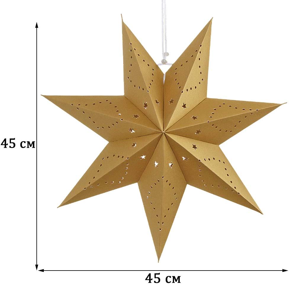 Семиконечная объемная звезда 45 см — великолепный декор из тонкого перфорированного картона. Создает красивые световые эффекты. Поставляется в сложенном виде, в комплекте шнур для фиксации объема и подвеса.