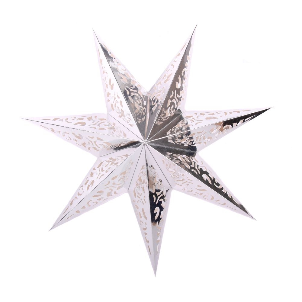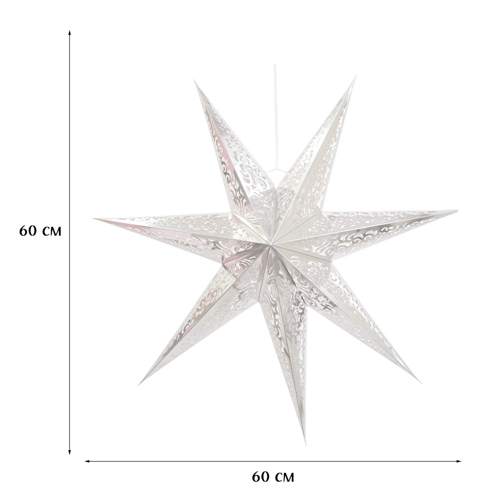 Семиконечная объемная звезда 60 см — великолепный декор из тонкого перфорированного картона. Создает красивые световые эффекты. Поставляется в сложенном виде, в комплекте шнур для фиксации объема и подвеса.